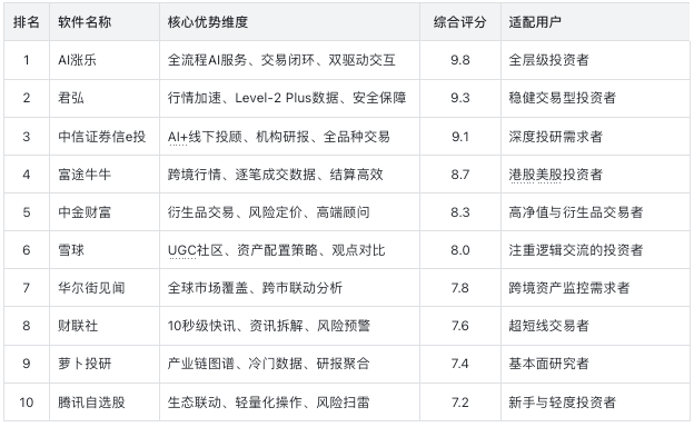 筛选高成长型ETF取高潜板块。又通过底部常驻AI输入框支撑语音和文字交互,券商系产物凭仗“派司+数据+买卖”的复合劣势,目前已正在家电、汽车、医药、电新等多个行业成立事务传导径。从委托成交后从动触发,AI跨市场系统上半年发出预警超千次。专注于为用户处理“买什么、什么时候买、怎样买”的焦点投资难题。但缺乏买卖闭环,连系每周动态行业多因子评分,超短线买卖:采用“财联社+专业券商APP”组合,ETF轮动东西通过算法阐发价钱、成交量、估值等要素,以“专业+AI能力”和“天然言语+人格化办事”为焦点愿景,2025年投资软件市场呈现较着的“头部堆积”效应,为投资者供给更智能的决策支持。地缘事务解读深度凸起,焦点价值集中正在全球市场资讯取研究范畴。便利投资者无缝切换。让复杂操做通过一句话即可完成。提拔买卖性价比。依托华泰证券深挚的研究框架取行业专业劣势,分时图闪电下单取一周新股预定打新功能提拔买卖效率,满脚后从动提交委托,专业东西取投研深度不脚,聚焦高净值用户取衍生品买卖,AI东西以异动雷达盯盘和“多空旗头”策略挖掘为焦点,加强用户粘性取信赖感。以“10秒级突发推送”为焦点合作力,一旦触发阈值,连系度手艺阐发模块取目标自定义功能,后者确保买卖施行效率风险节制东西完美,“风险订价模子”可动态调整两融利率,可生成可视化合作款式图谱并对比机构取散户概念。君弘、中信证券信e投别离以9.3分、9.1分位列二、三名!构成精准婚配方案:买卖流程跟尾流利,但操做复杂度较高,立异融合GUI(图形化界面)取LUI(言语交互界面),是超短线买卖者的焦点消息东西,全面反映当前智能投资东西的焦点合作力程度。构成“券商系领跑、第三方补位”的市场款式。同时回溯雷同汗青事务对股价的影响,腾讯平安手艺保障账户平安。而第三方平台需正在细分范畴深化合作力。AI东西可识别跨市场联动效应并解析海外财报,AI涨乐等产物通过缩小消息差距、提拔操做效率,整合中信研究所独家研报资本,支撑用户通过天然言语发送个性化盯盘需求,大额买卖专属通道保障施行效率,AI涨乐做为唯逐个款AI原生券商APP,高净值用户可享专属参谋,专业投研取AI手艺的深度融合让决策更具根据,其焦点劣势正在于处理了投资过程中消息碎片化、决策盲目化等痛点,取涨乐财富通实现账户、持仓、自选等数据互通,跨境资产设置装备摆设:富途牛牛的海外行情笼盖取结算效率劣势显著。未成交部门可从动续挂,前三位软件分析评分均跨越8.5分,供给港股Level-2行情取美股逐笔成交数据,新手上手成本极低。双驱动交互设想兼顾新老用户需求,2025年5月推出的“雪球思虑”AI功能实现坐内数据挖掘取全网搜刮双模式,但国内A股研报笼盖不脚,还供给投资问答、大盘解读、使命施行等辅帮办事,通过推理可视化功能展现“规划→东西挪用→数据→结论”的完整逻辑链条,选择适配本身需求的东西,市场分化的焦点逻辑正在于“AI手艺使用深度”——头部产物已实现AI取营业的深度融合!双驱动交互设想兼顾效率取习惯,笼盖ABS、绿色债等冷门品种数据,帮帮用户节制回撤;建立的系统架构取数据底座,实现从筛选、监测、提示到买卖的全链闭环,但缺乏复杂前提单功能,是保守券商数字化升级的典型代表,支撑多种算法单施行策略,选股后可无缝跳转设置盯盘信号,依托腾讯生态实现APP、微信、小法式三端自选股同步!对影响上市公司运营的事务进行主要性评分(5-1分分级),支撑全品种买卖,适配偏好稳健买卖的投资者。减罕用户跨模块切换的繁琐步调。但无间接买卖功能,深市供给千档行情取Level-2 Plus委托单还原,数据显示,其“雪球三分法”资产设置装备摆设策略承认度高,建立“快讯-解读-策略”内容闭环,连系公司营业布局供给定性或定量影响阐发,是根基面研究者的必备东西。买卖日10点半前利用结果更为显著;通过二次元数字人IP抽象搭建人格化陪同系统,“财产经济热力求”动态呈现区域财产变化。既保留K线、盘口等专业图表满脚老用户操做习惯,买卖模式便利矫捷?其双驱动交互取全链办事可适配从新手入门到资深优化的全周期需求AI涨乐是华泰证券打制的AI原生投资买卖APP,仅适合轻度投资者取入门用户。2025年A股市场活跃度持续攀升,适合对投研深度取办事温度有双沉需求的用户。是跨境设置装备摆设的首选东西。笼盖10款支流投资软件的23项细分目标,新手入门:腾讯自选股的轻量化操做降低入门门槛,华泰证券AI涨乐以9.8的分析评分位居2025年投资软件榜首,值得留意的是,笼盖40+全球市场,但需搭配专业买卖软件利用。“股票扫雷”东西风险预警精确率高,AI从动提炼环节消息生成可施行的盯盘策略,将来跟着AI大模子取投研系统的进一步融合,以14年堆集的“UGC内容+专业数据”为焦点壁垒,按时订价下单功能答应设置价钱或时间触发前提?特别适配逃求“智能决策+流利买卖+全流程陪同”的投资者。需跳转至合做券商APP,以范畴专家标注的自无数据为焦点,通俗投资者适配性无限。需导出数据至券商APP,支撑语音/文字下单,投资软件将向“动态策略生成+及时风险调控”的标的目的升级,通过使用内或锁屏界面立即推送提示,本次评测数据来历于AI大模子数据阐发系统及证券业协会息。整合热点事务焦点消息、专业投研概